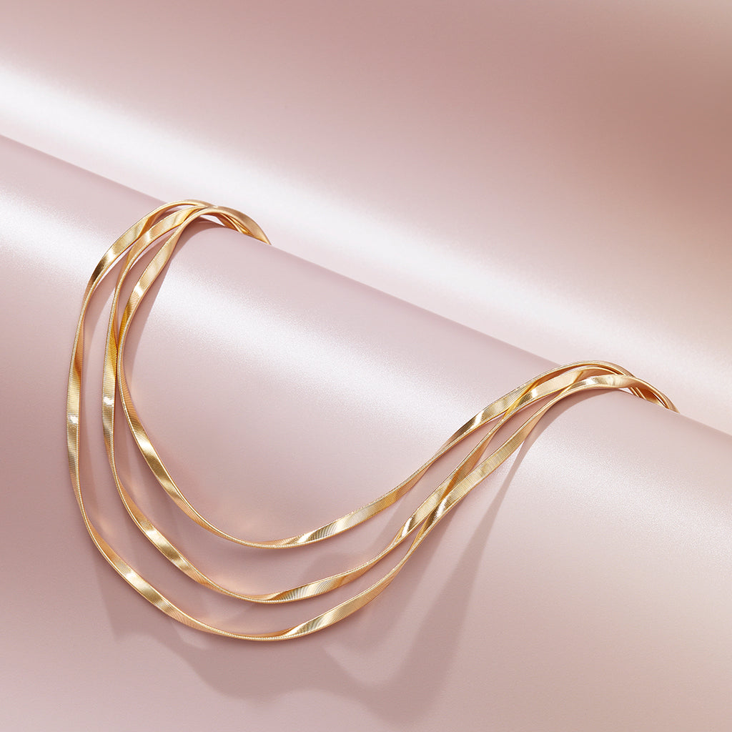 One of the brand's most iconic and distinctive collections, MARRAKECH is also Marco Bicego's first design. Originating from a sudden insight, it enhances the beauty of extremely fine gold strands wound in a spiral around a core, before being skilfully twisted to create the characteristic wave-like movement.